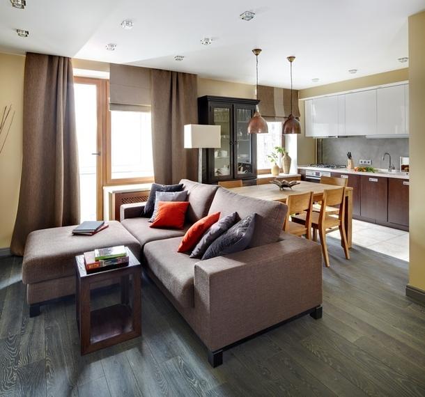 По рассказам Дарьи Назаренко, дизайнера, который курировал проект, прихожую в этой квартире сделали просторной: через широкий проем, вы сразу попадаете в большую гостиную, совмещенную с кухней и столовой.