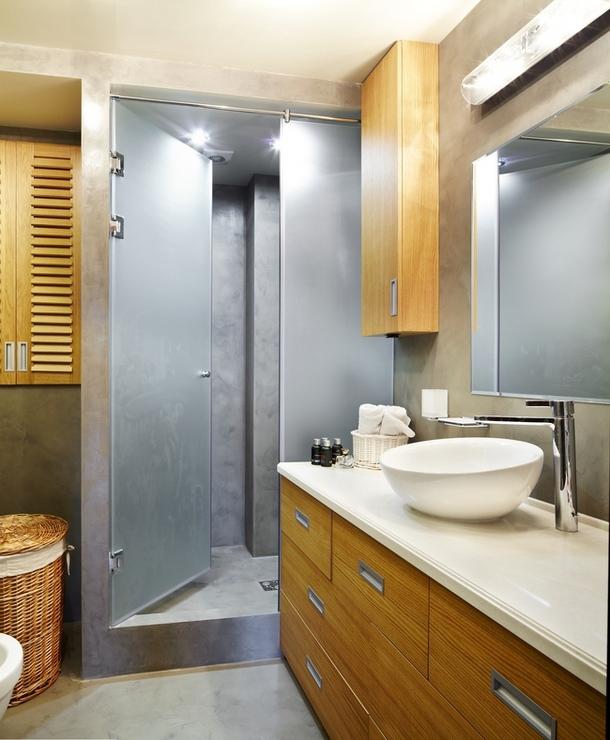 Ванную увеличили за счет коридора. Стены покрыли декоративной штукатуркой.