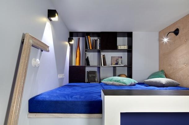 Выделить спальное место помог подиум. А ведущие на него ступеньки – это еще и посадочные места на случай вечеринки.