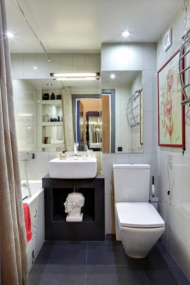 В ванной – плитка лежит не горизонтально, а вертикально. Это также позволяет зрительно увеличить пространство.