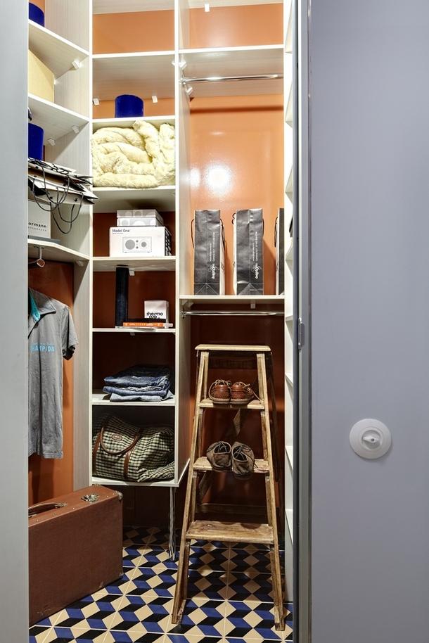 Гардеробная в маленькой квартире совсем не роскошь, но хорошая альтернатива шкафам, которые загромождают пространство. Полки идут до самого потолка, а дотянуться до них поможет только лестница.