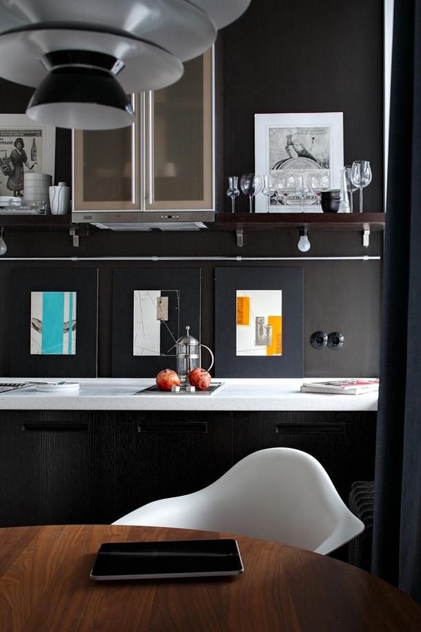 “Я решила подчеркнуть высоту комнат – от этой иллюзии квартира кажется просторней”, – говорит Кира. Нужный эффект сделать помогают светильники на длинных подвесах, рога на столике в гостиной и шкафчик на кухне, который достает до самого потолка.