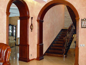 Ламинированные МДФ-конструкции - оптимальный вариант для помещений с повышенной влажностью. Они выдерживают резкие перепады температуры и стоимость такой арки намного меньше. Держать форму независимо от климатических условий арке из МДФ удаётся за счёт специальной износостойкой плёнки. Стоимость ее довольно низкая, поэтому она доступна широкому кругу покупателей. Шпонированные (ламинированные) арки внешне очень похожи на цельнодеревянные, но выигрывают по цене и срокам эксплуатации. Помимо всего прочего, шпон не впитывает посторонние запахи, как дерево, легко моется и спокойно переносит переохлаждение.