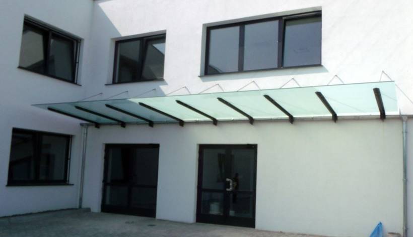Количество кронштейнов определяется шириной навеса. Козырьки над дверями со стекла очень элегантные и современные. Установка такого навеса очень простая, а стоимость зависит от количества и длины кронштейнов. Козырьки из стекла прекрасно себя очищают, когда, например, идет дождь или мокрый снег.
