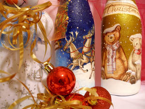 Не забудьте дополнительно ваши бутылки декорировать колокольчиками, веточками флористическими, бантами, шариками, мишурой, блестками и прочими новогодними атрибутами или с рождественской тематикой.