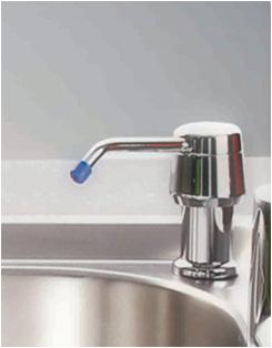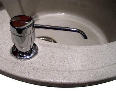 Над поверхностью торчит лишь трубка, черз которуюна руки попадает мыло жидкое. такой аксессар много места не занимает, смотрится довольно лаконично, да и его конфигуряция такова, что не поранишься. покупают чаще всего врезные диспенсерв из нержавеющей стали, полированной или матовой, из камня искусственного или пластика разноцветного.
