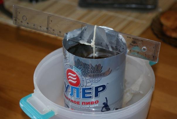 - Кладем на края стаканчика линейку и на нее наматываем фитиль так, чтобы тот оказался натянутым как раз посередине.