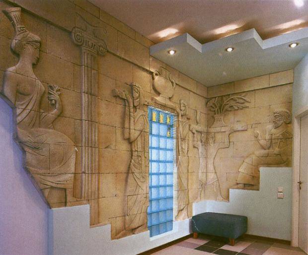 Вышеуказанный материал представлен производителями в разных воплощениях, правда, декораторы предпочитают работать с искусственным клоном, чем с натуральным сырьем. Дробиться оно сложно, очертания нужно формы принимает после огромных физических усилий, да и стоит столько, что легче купить новую квартиру, чем заказать отделку старой.