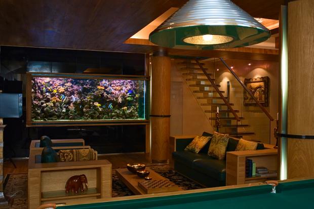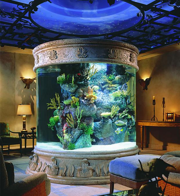 Рифовый аквариум в гостиной и холле большого дома – это не просто биотоп придонного кораллового рифа, но и миниатюра прибрежной полосы вдали от океанических течений, которые человек создает искусственным образом, чтобы преобразить интерьер своего жилища. Не обязательно, чтобы холл или гостиная были выдержаны в морском стиле: такой аксессуар неплохо смотрится и в египетском стиле, и в восточном. Жаль, что модерн с его плавными линиями не выносит острых углов и прямолинейности, но для большого аквариума не обязательно иметь строгие черты.