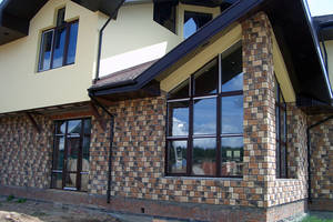 - Тонированный вариант, или полупрозрачное стекло – необычное темное пятно, играющее с прохожим в прятки. За ним не видно тех, кто находится внутри здания. Кажется, что такое строение не пропускает внутрь стены свет, однако, это обычный обман зрения. Те, кто находится внутри архитектурной формы, дискомфорта не испытывают, да и полупрозрачный материал дает возможность видеть окрестности так, как будто перед ними панорамные окна, а не стены. такая особенность тонированного стекла на фасаде частного дома срывает от посторонних перемещения хозяев из комнаты в комнату, обстановку дома и его насыщенность техническими изделиями.