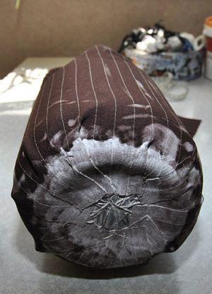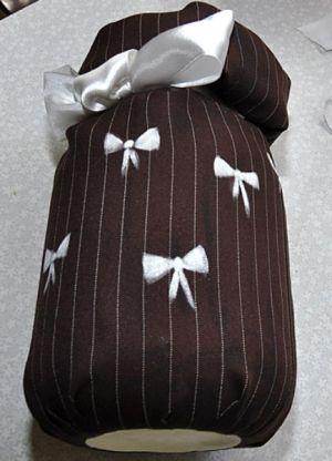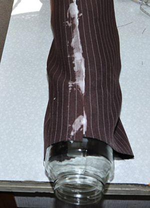 Как только конструкция высохла, вытяните цилиндром материал: получается двухслойная труба, которую надо скатать по направлению к горлышку банки валиком. Как только все получилось, подвязываете капроновой лентой, пришиваете ее и формируете бант.