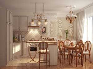 • Кухни в стиле прованс – уточенный стиль французской деревни. Мебель и отделка выполнены «по-сельски», но с налетом изящества. Рабочую поверхность можно облицевать кафелем с пасторальными сюжетами. Подбирается вытяжка, плита, духовка с плавными линиями и пастельными оттенками в дизайне. В качестве декоративных деталей используют вазы с фруктами, статуэтки пастушков. За стеклянными дверцами буфета выставляют изысканный сервиз.