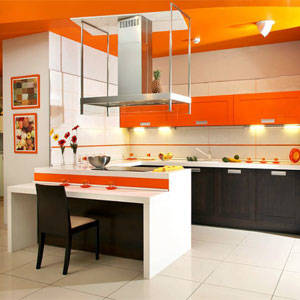 Что касается самой «кухни», т.е. полок, раковины и рабочего места хозяйки, то здесь в первую очередь следует обратить внимание на качество мебели. Часто ножи соскакивают, падает посуда. Поэтому качество кухонных шкафов и полок должно быть соответствующим. Создавая оригинальный дизайн, отдайте свой выбор в пользу яркого цвета, в нашем случае, оранжевого. Солнечный цвет сделает кухню ярче и позитивнее, а белый цвет немного компенсирует экспрессию цвета. Холодильник можно выбрать также в белом цвете. Для создания акцентных деталей, можно использовать разные аксессуары, например апельсины в белой чаше. Дизайн кухни дополнят забавные часы или шторы. В центре стола можно расположить вазу с цветами. Главное, не перегрузить комнату обилием деталей. Остановите свой выбор на двух-трех аксессуарах в цвет. Этого будет достаточно, чтобы создать уникальную современную и стильную кухню.