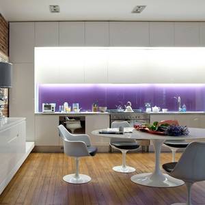 Итак, простым способом добавить в стиль каплю «модерна» является замена мебели на современную. Мебель в стиле модерн выглядит очень стильно и модно. Она напоминает мебель из фильмов про будущее, Марс и НЛО. Стол может походить на летающую тарелку, при этом он имеет гладкие линии, глянцевую структуру. Белый цвет как нельзя лучше завершит образ стола. Стоит лишь добавить стулья в таком же дизайне – и ваша кухня совершенно поменяет свой вид. Более дорогостоящим вложением в декор является приобретение самой «кухни», то есть шкафчиков. Глянцевая структура лучше всего отражает стиль модерн. Цвет может быть разный, в зависимости от ваших предпочтений. Цвета металлик, белый и черный станут наилучшим выбором. Чтобы украсить стиль, добавьте необычную подсветку нестандартного цвета, к примеру, фиолетового или розового. Можно также использовать неоновые лампы, которые будут прекрасно отражать белый цвет «кухни».