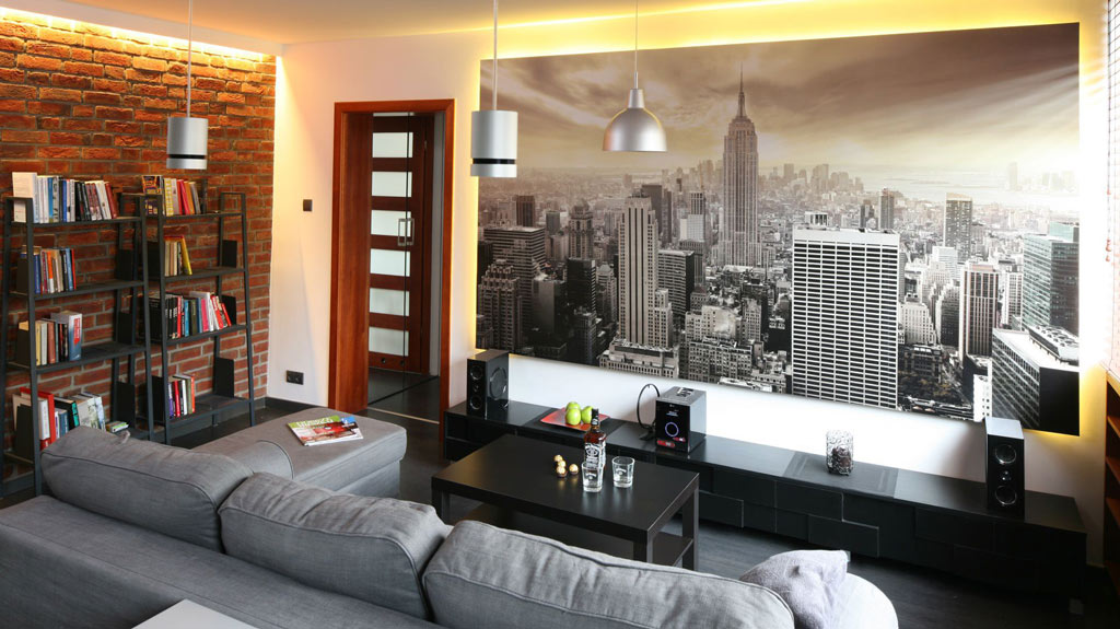 Оклейка одной из стен является самым распространенным вариантом, таким способом вы визуально выделяете одну стену и делаете на ней контрастный или монохромный акцент. Размещение принтов на части или половины стены зонирует помещение, что актуально для комнат-студий при выделении гостиной и кухонной зоны.