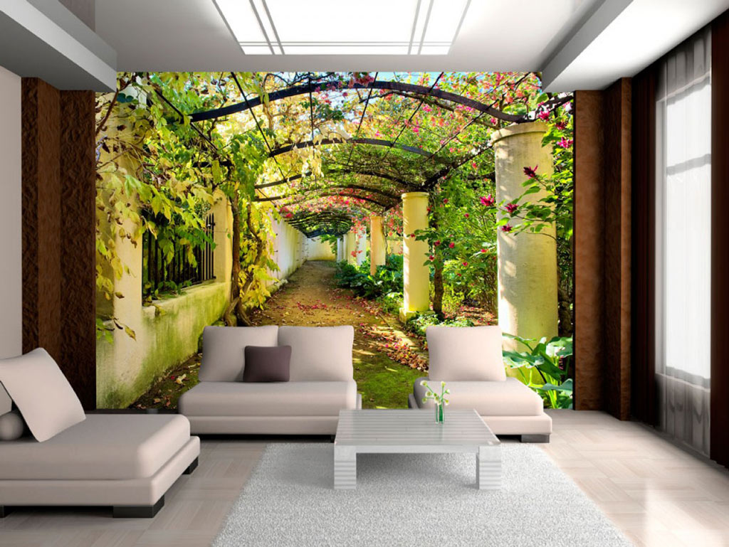Угловая отделка, или оклеивание двух соединяющихся стен поможет стереть угол, создавая ощущение свободного пространства. Более смелым решением будет оформление изображениями четырех стен сразу, при этом цвета должны быть яркими, не кричащими, гармонично вписываясь в остальную обстановку.