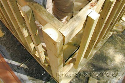 Бруски ограждения крепятся к продольной доске с помощью саморезов по дереву. При чём, для качественного крепления и усиления конструкции рекомендуется крепить бруски с помощью четырёх саморезов, по два с каждой стороны.