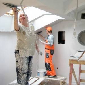 Черновой ремонт в новостройке заключается в формировании стяжки пола в жилых комнатах, штукатурке стен, потолка, утеплении окон и штукатурке оконных откосов. В панельных и монолитных домах после штукатурки делают шпаклевку под обои или покраску – стены не выгнутся. В кирпичных шпаклевать сразу под покраску нет смысла; до окончания усадки придется довольствоваться обоями.