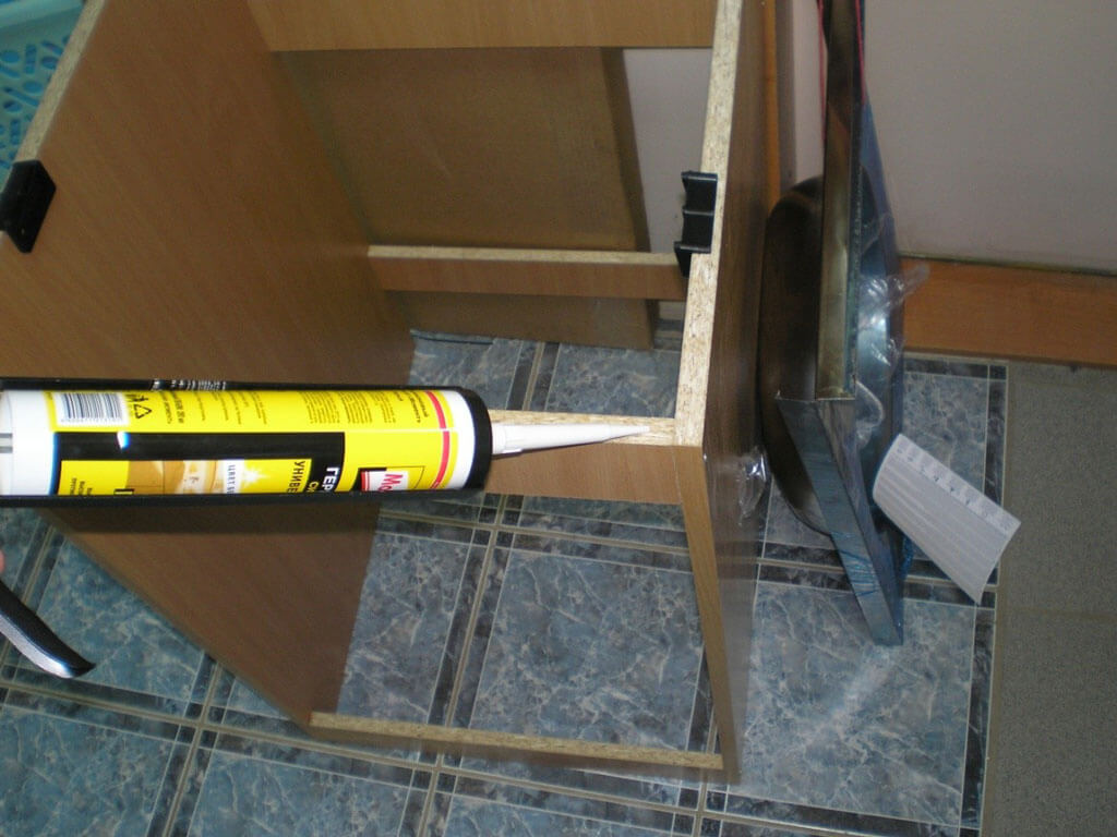 - В случае если габариты основания идеально соответствуют габаритам мойки, то возможно применять клеевую методику. Для этого на торцы всех стенок подстолья наносим слой силиконового герметика. Поверх силикона укладываем раковину, шепетильно сглаживаем и прижимаем на 12 часов. По истечению этого времени груз возможно снимать.