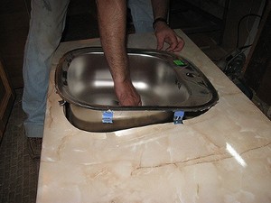Иногда, если материал раковины трудно поддается механической обработке, ее можно просто наклеить на верх тумбы при помощи соответствующего клея.