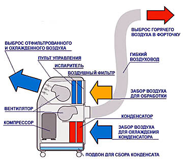 Принцип работы мобильного кондиционера закрытого типа иллюстрирует хорошо известный рисунок, см. справа. Он такой же, как у стационарного сплита или бытового холодильника: