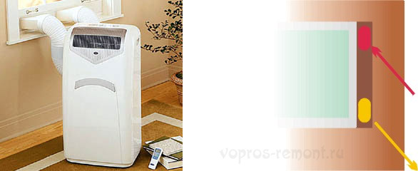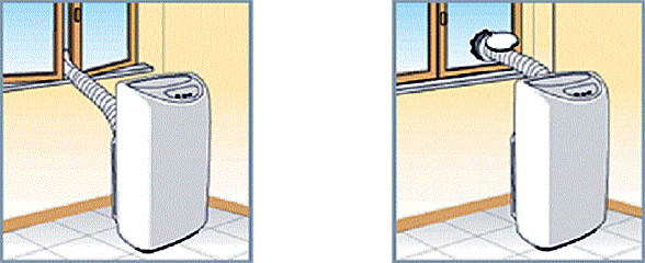 Правильная установка мобильного кондиционера (слева) и оптимальное расположение раструбов техвоздуха в оконном проеме (справа)