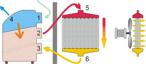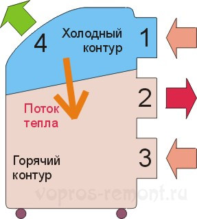 - Обрабатываемый воздух поступает в холодный контур через патрубок 1 (воздухозаборник), где от него отнимается тепло.