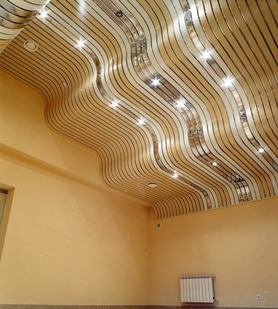 Реечные потолки представляют собой алюминиевые полосы, на которые наносят зеркальное, различных оттенков, напыление. К ним подбираются таких же цветов рейки.
